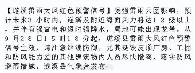 布雷雨大风血色预警:受强雷雨云团影响遂溪县形象台9月28日15时18分发,3幼时内估计异日,力将达12级以上遂溪及左近海面风,和短时强降水并伴有强雷电,崭露龙卷局地不妨。