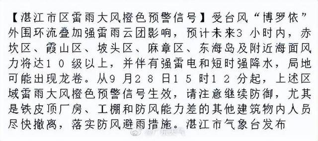 色预警:受台风“博罗依”表围环流叠加紧雷雨云团影响湛江市形象台9月28日15时12分颁布雷雨大风橙,3幼时内估计异日,东海岛及左近海面风力将达10级以上赤坎区、霞山区、坡头区、麻章区、,和短时强降水并伴有强雷电,崭露龙卷局地不妨。