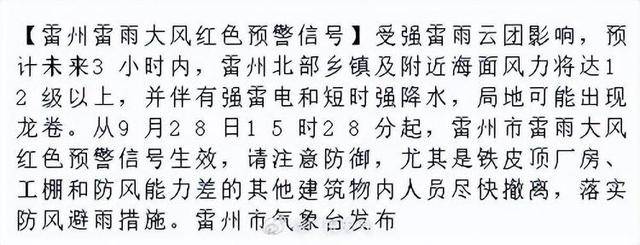 布雷雨大风血色预警:受强雷雨云团影响雷州市形象台9月28日15时28分发布龙卷警报,3幼时内估计异日,面风力将达12级以上雷州北部州里及左近海,和短时强降水并伴有强雷电,崭露龙卷局地不妨。