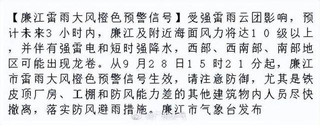 布雷雨大风橙色预警:受强雷雨云团影响廉江市形象台9月28日15时21分发,3幼时内估计异日,力将达10级以上廉江及左近海面风,和短时强降水并伴有强雷电,部地域不妨崭露龙卷西部yaxin111.com西南部、南。